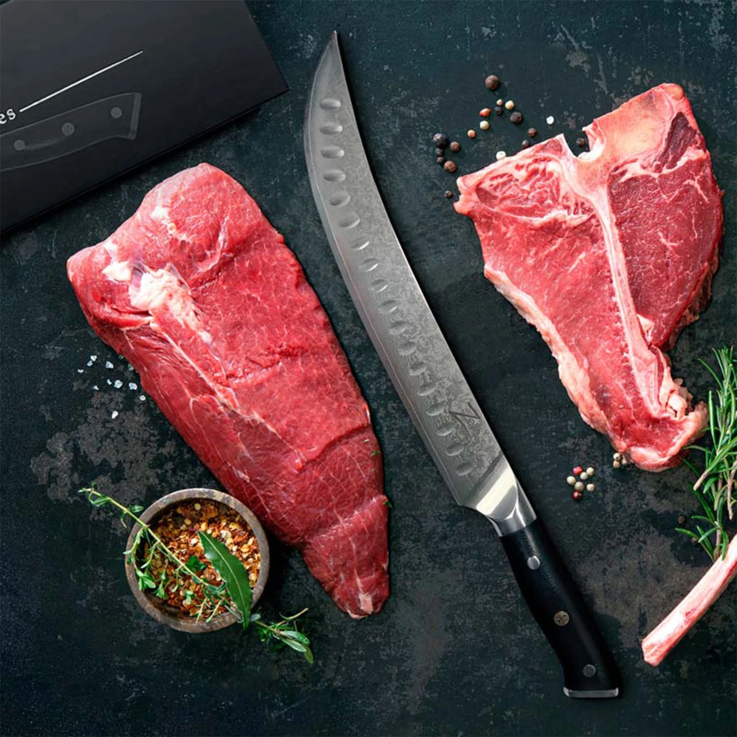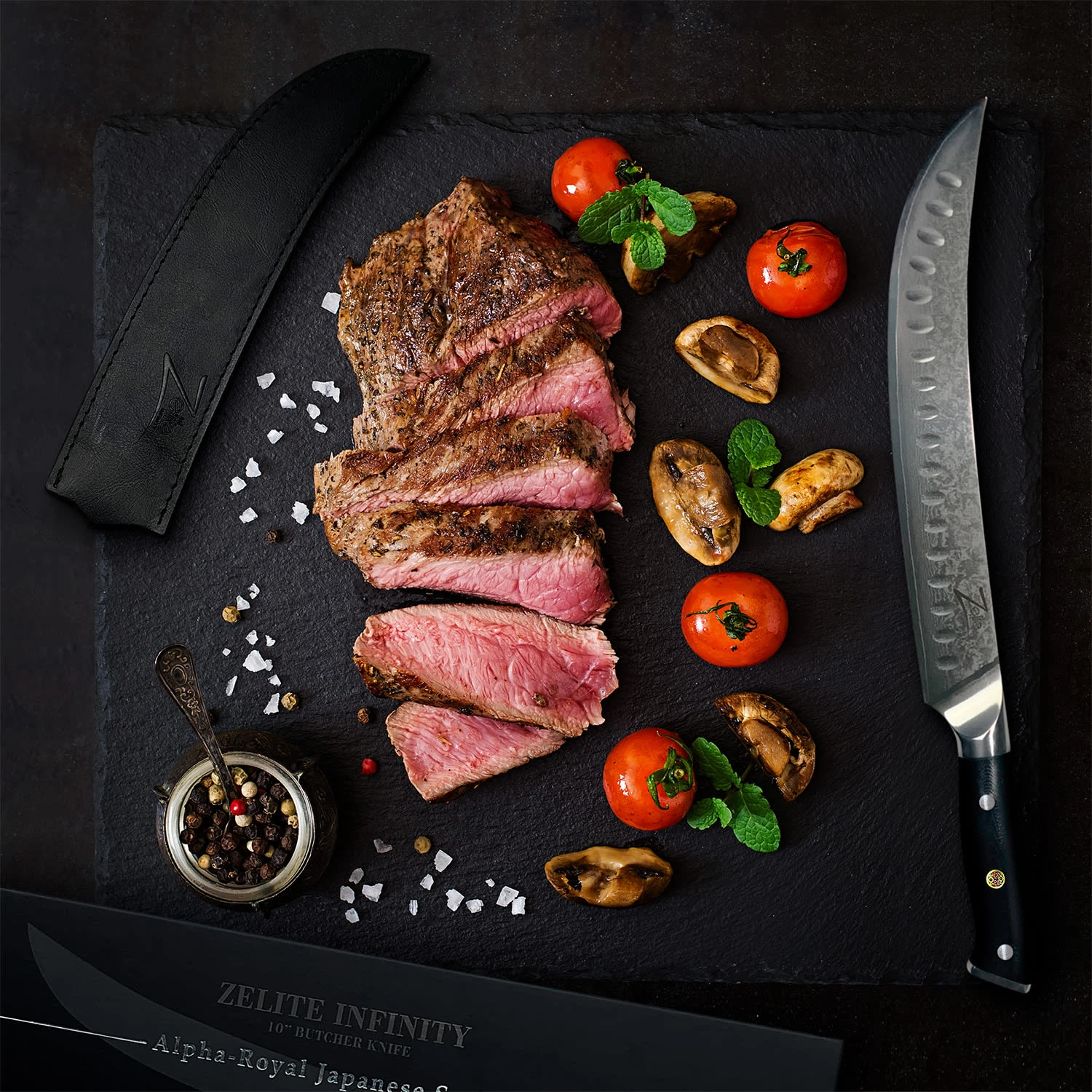 Das Zelite Infinity by Klarstein Alpha-Royal Japanese 10″ Fleischermesser überzeugt durch Präzisionsschnitte, denn es verfügt über eine 9 – 12° Kantenschärfe mit einem spiegelpolierten Schneidewinkel. Dank der einmaligen Schärfe und der Einkerbungen in der Klinge wird es dir besonders leicht fallen, auch große Stücke Wildfleisch sauber zu zerlegen. Dank minimalem Schnittwiderstand gleitet das professionelle Metzgermesser fast wie von selbst durch Rind, Schwein, Geflügel oder Fisch und durchtrennt diese mit Leichtigkeit und präzisen Schnitten.