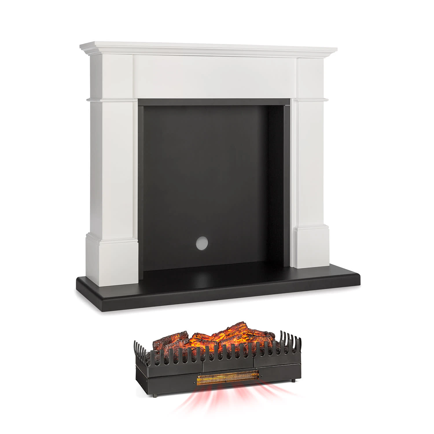 Kamin-Feeling ganz ohne Schornstein und in jeder Wohnung: Der Klarstein Biel Dekokamin bildet den passenden Rahmen für den Klarstein Kamini FXL Kamineinsatz mit Heizfunktion. Sehr schnell hat man auf diese Weise einen wunderbaren Elektrokamin gebaut, der sich kaum vom Original unterscheiden lässt. Die Oberseite dient als Ablagefläche, auf der zum Beispiel Fotorahmen oder Blumen aufgestellt werden können und vom Charme des Kamins profitieren. Dank der robusten Ausführung aus MDF und der Möglichkeit zur Wandverschraubung steht das Gehäuse absolut sicher. Flackernde Romantik mit optionaler Wärme beschert der direkt mitgelieferte Klarstein Kamini FXL Elektro-Kamineinsatz. Eine täuschend echte LED-Flammenillusion sorgt für knisternde Atmosphäre das ganze Jahr und sobald die Abende kühler werden, bringt die zuschaltbare Heizfunktion mit wahlweise 1000 oder 2000 Watt Leistung wohlige Wärme wie ein echter Kamin.
