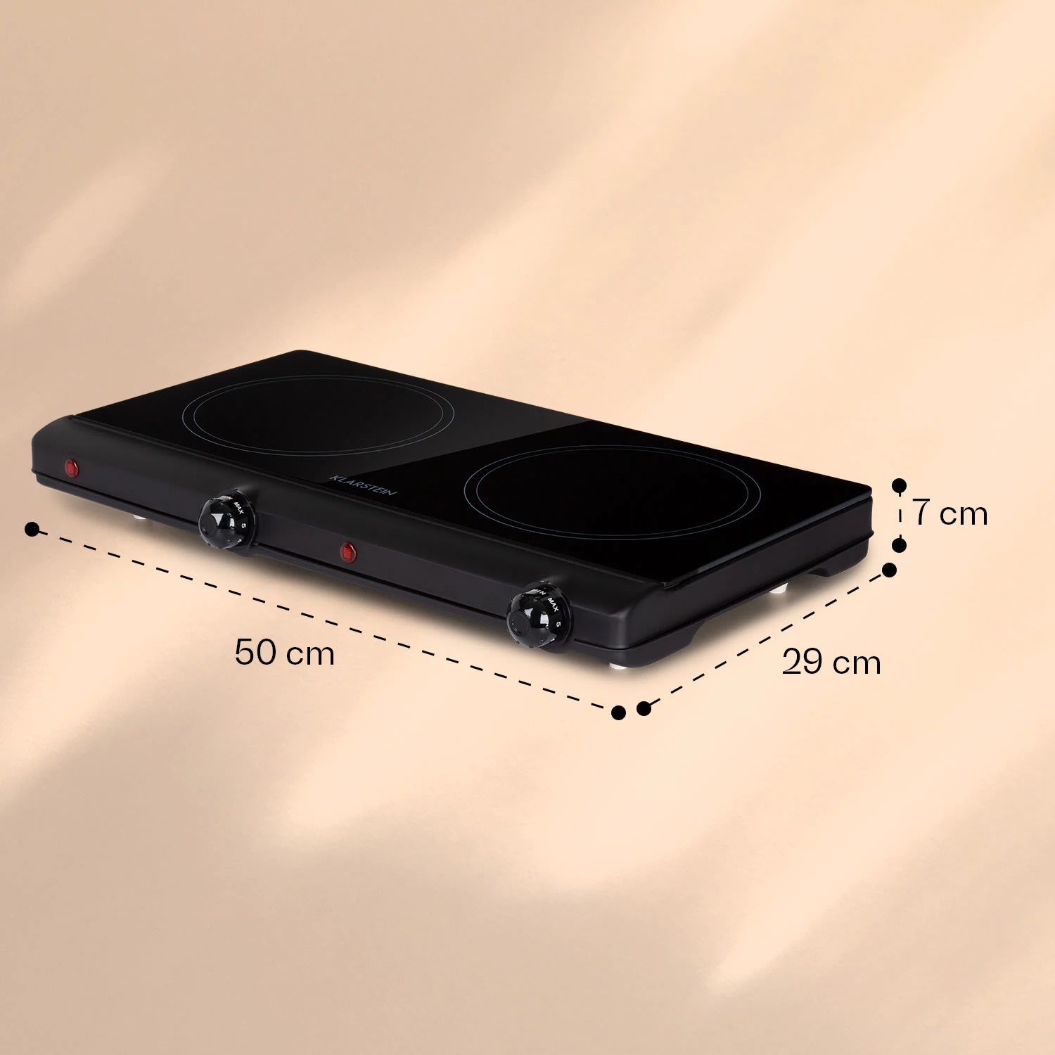 Bedient werden die beiden Kochzonen des Kochfelds unkompliziert mit zwei Thermostat-Drehreglern. 5 Stufen ermöglichen dabei sanftes Köcheln genauso wie rasantes Erhitzen und Braten. Die erhitzte Oberfläche erlaubt auch nach dem Abschalten das sparsame Kochen mit Restwärme. Nach dem Kochen ist die Kochplatte dank ihrer pflegeleichten und edlen Oberfläche aus gehärteter Glaskeramik im Handumdrehen wieder sauber. Dank der kompakten Größe und der niedrigen Leistungsaufnahme eignet sich das Klarstein Cookbuddy Doppelkochfeld ideal als mobiler Reisebegleiter, zum Beispiel bei Campingtouren oder für die Sommerfrische im Gartenhäuschen.