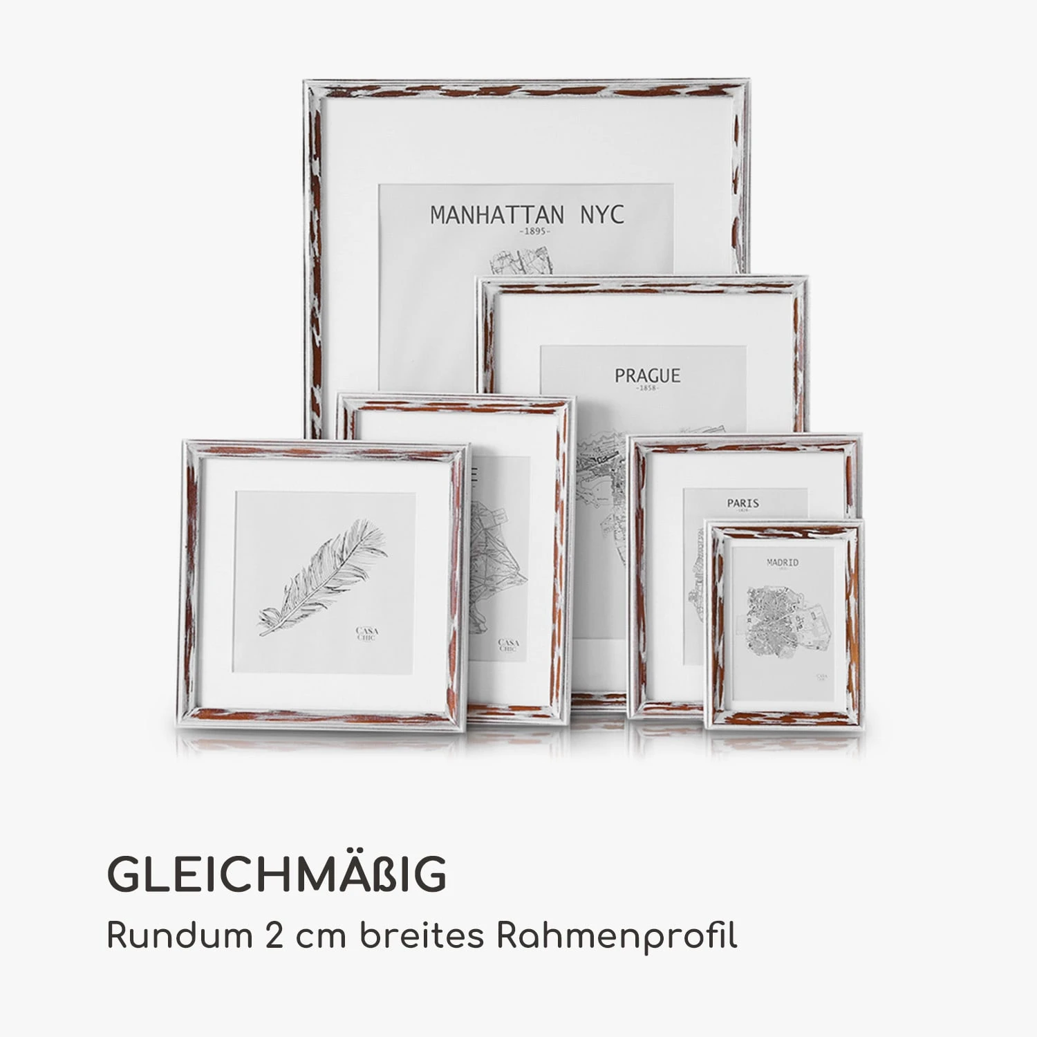 Jeder Rahmen ist ein Unikat: Der Lancaster Bilderrahmen von Casa Chic by blumfeldt aus edlem Pinienholz im Shabby-Chic-Look ist handgearbeitet und bringt deine Fotos und Bilder sowohl im Hoch- als auch im Querformat ideal zur Geltung. Bleibe flexibel und gestalte wunderschöne Wandcollagen oder arrangiere deine Lieblingsfotos auf dem Sideboard oder im Regal. Das mitgelieferte Passepartout überlässt dir die Wahl des passenden Bildausschnitts. Das gleichmäßig breite Rahmenprofil und die Frontscheibe aus Echtglas sorgen für Eleganz und besten Schutz.