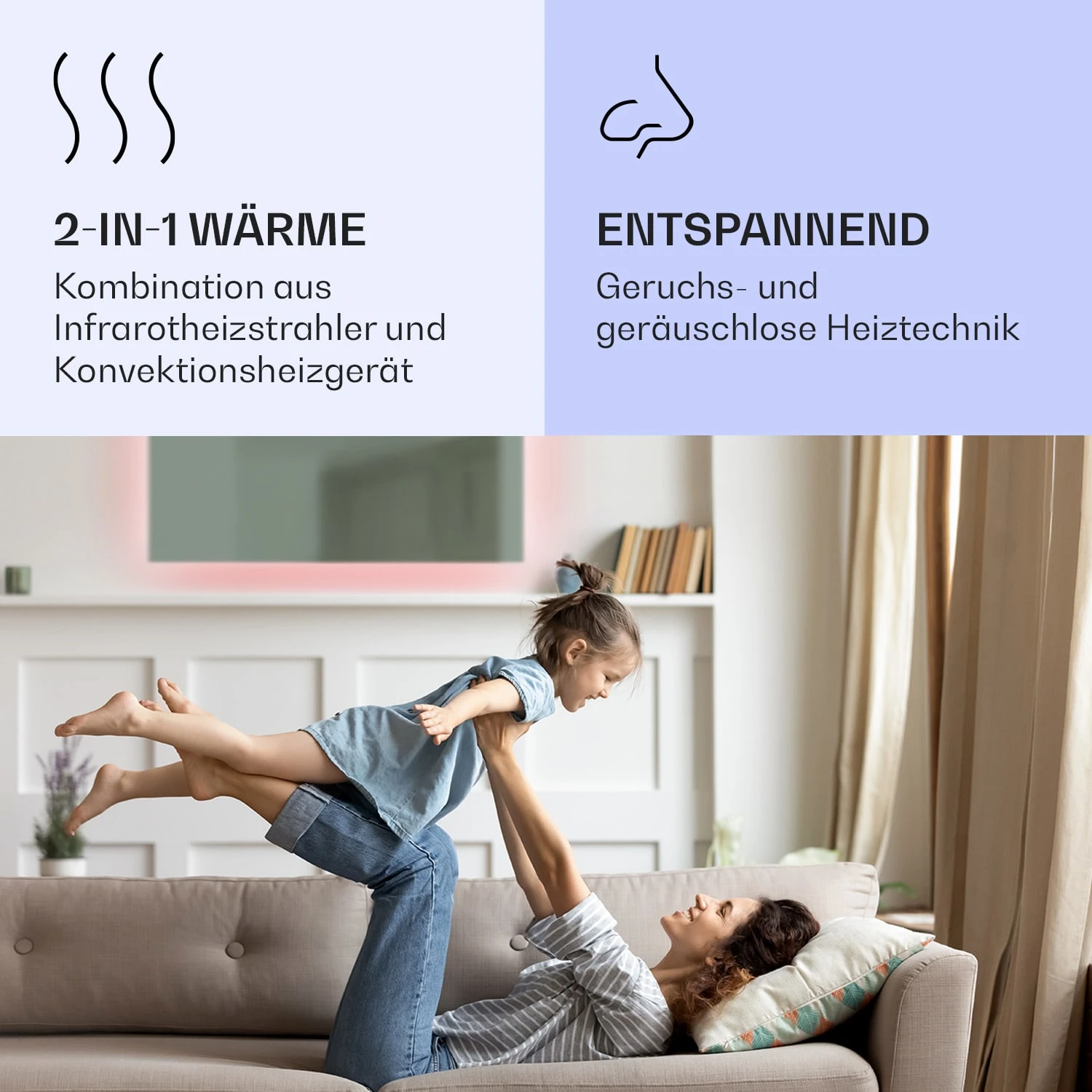 Doppelte Leistung bei gleicher Größe, die Klarstein Mojave 2-in-1 Heizgeräte vereinen geschickt einen Infrarotheizstrahler mit einem Konvektor und schaffen so in platzsparender Bauweise nicht nur schnell fühlbare Infrarot-Wärme, sondern erzeugen auch kuschlig warme Raumluft über rückseitig aufsteigende Wärme. Dabei hast du, passend zur Größe deines Raums, die Wahl zwischen einem 500, 750 oder 1000 Watt starken Heizgerät. Das gradweise einstellbare Thermostat und der Wochentimer werden dabei ganz smart via Klarstein-App oder per Fernbedienung gesteuert. Dank IP44 Sicherung sind die Konvektoren auch bestens fürs Bad geeignet. Ganz egal wo du dein neues Klarstein Mojave Smart Heizpanel aufhängst, mit seinem farbigen RGB-Ambientelicht erzeugt es überall die passende Atmosphäre.