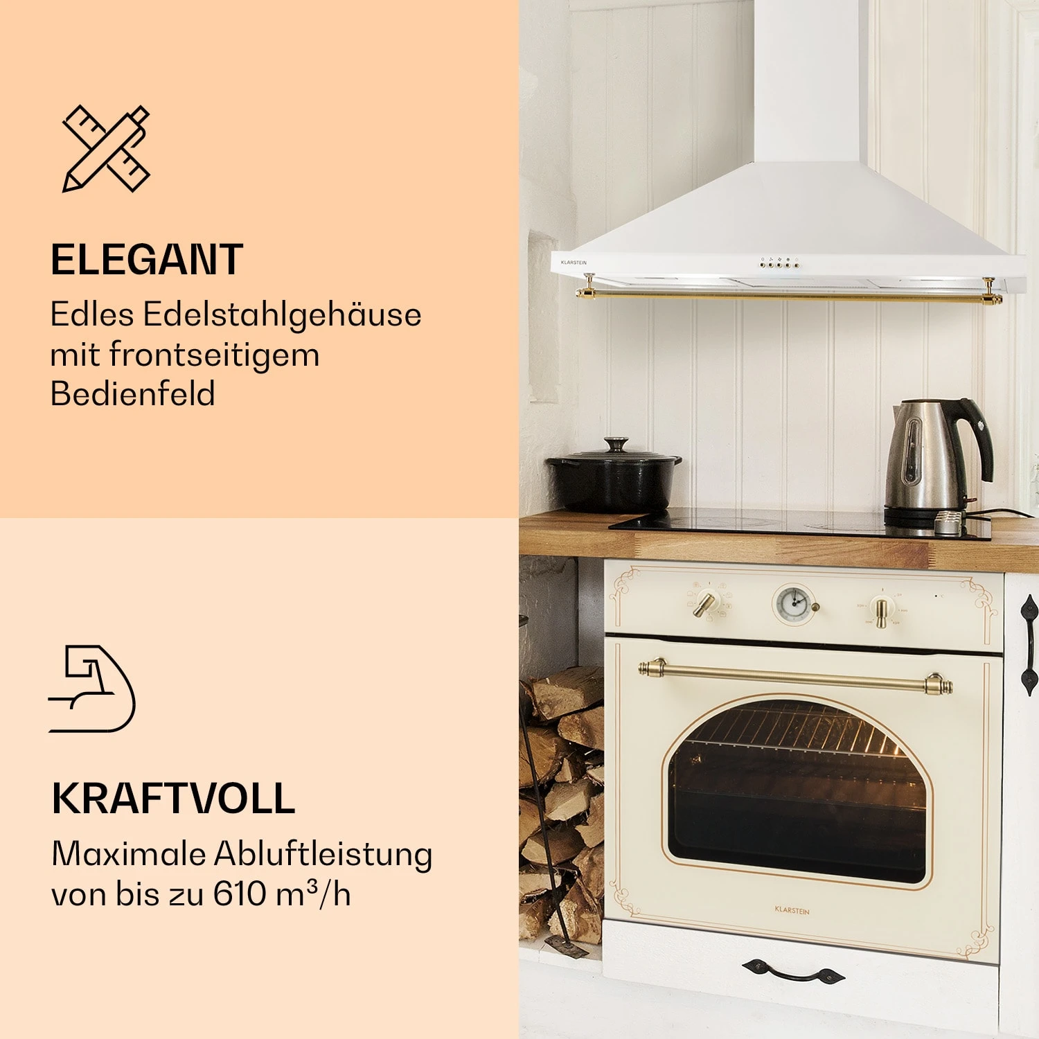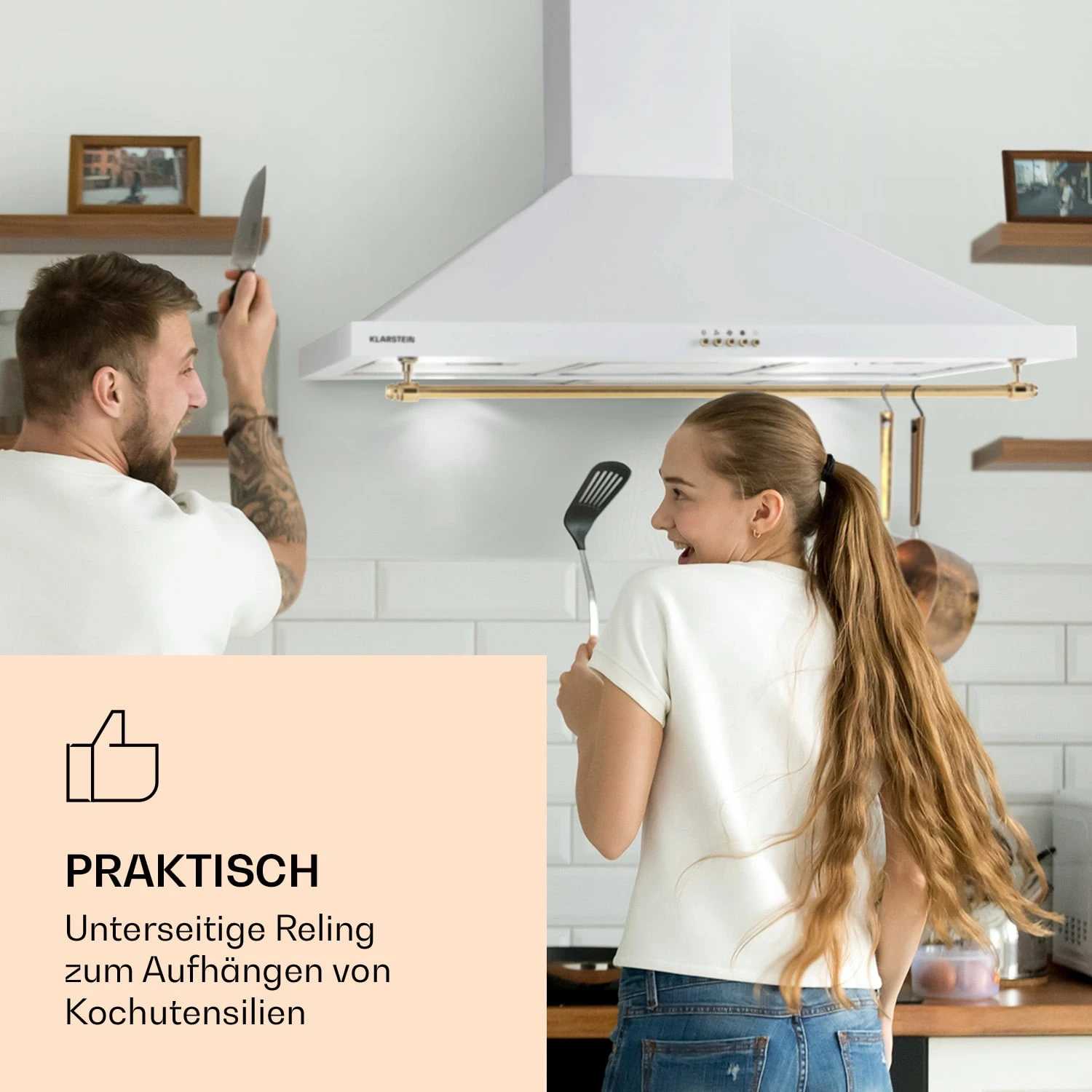 Mit der Klarstein Montblanc 90 Dunstabzugshaube verschwinden Dampf und Brodel schneller als deine Töpfe sie erzeugen können. 165 Watt Motorleistung und 3 Ventilationsstufen saugen bis zu 610 m³ Luft pro Stunde durch den Abluftschlauch nach draußen. Die zuschaltbare LED-Kochflächenbeleuchtung sorgt für erhellende Einblicke in Pfannen und Töpfe. Der zweiteilige, höhenflexible Kamin verbirgt geschickt den Abluftschlauch und eine schmucke Reling an der Abzugshauben-Unterseite dient der stilvollen Aufbewahrung von Küchenhelfern.