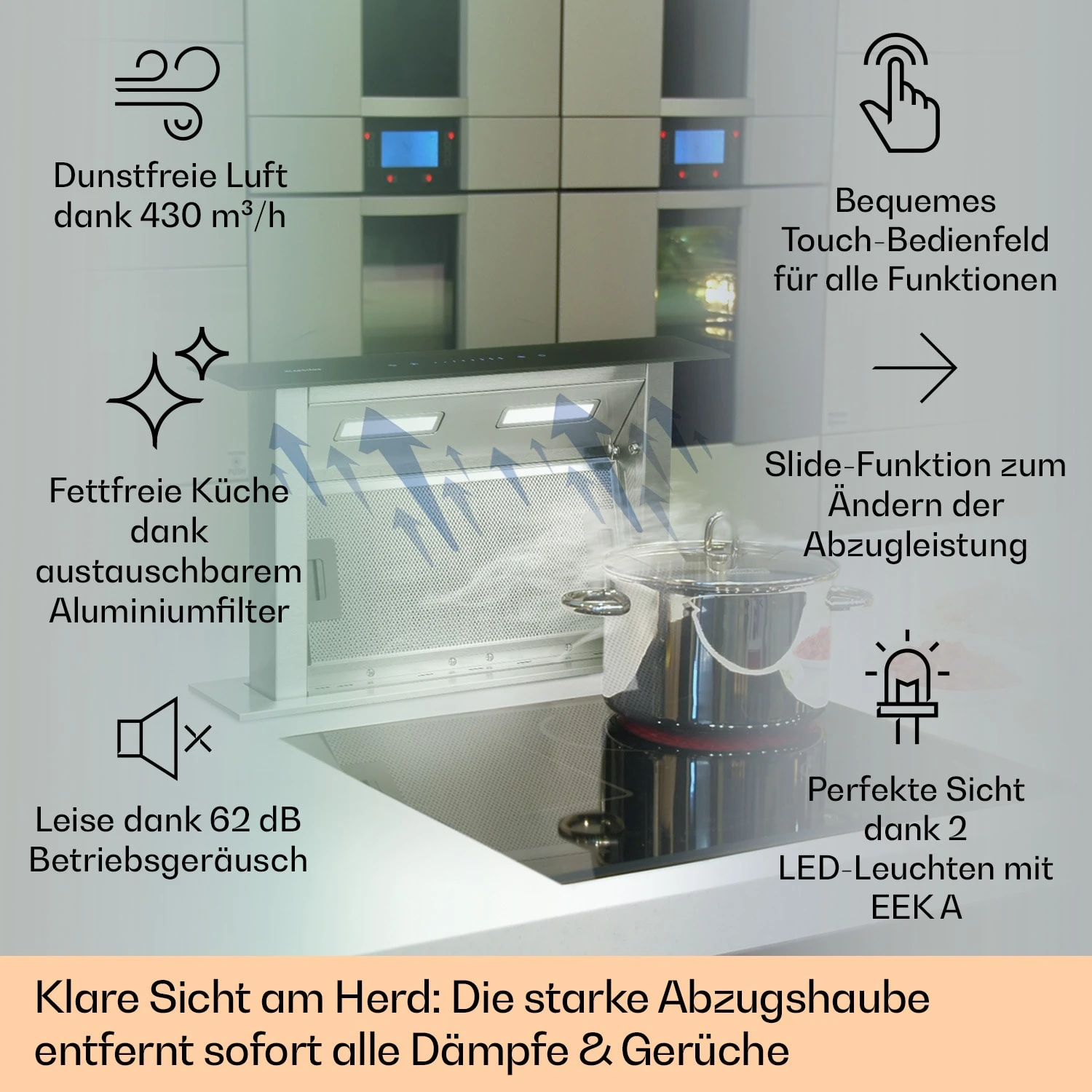 Mit einer Leistung von maximal 430 m³/h im Abluftbetrieb beugt die Dunstabzugshaube Geruchs- und Dampfaufkommen vor. Gleich vier Leistungsstufen können über eine Slider-Leiste ausgewählt werden. Ein Ausschalt-Timer ermöglicht ein bis zu 40-minütiges Nachlaufen der Abzugshaube. Die integrierte Beleuchtung kann in acht Helligkeitsstufen geregelt werden, so dass man stets einen Blick in die Karten der mitspielenden Topfrunde werfen kann.