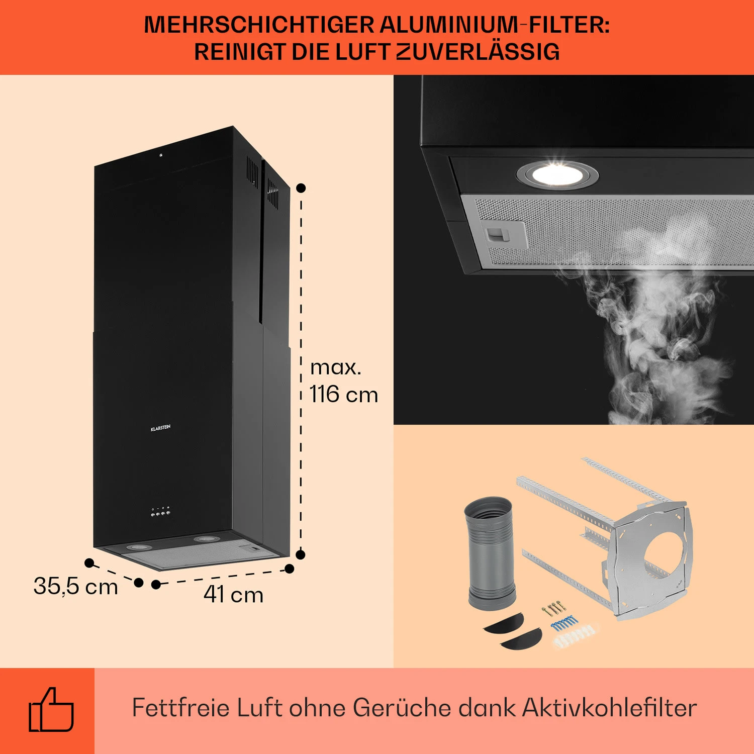 Die Abzugssäule wird stabil und sicher an der Decke befestigt und kümmert sich zuverlässig um entstehenden Küchendunst. In drei Leistungsstufen wälzt sie bis zu 624 m³/h Luft unermüdlich um und befreit so die Küchenluft von Fett und Gerüchen. Damit ist sie besonders für große Raumverhältnisse mit Kochinsel geeignet. In allen Betriebsstufen spendet eine zuschaltbare, integrierte LED-Kochflächenbeleuchtung helles, weißes Licht. Betriebsstufen und Licht werden ganz einfach über das frontseitige Bedienfeld gewählt. Die Inselhaube eignet sich sowohl zum Abluft- als auch Umluftbetrieb. Damit der Abluftschlauch dabei nicht zu sehen ist, verfügt sie über eine ca. 60 cm lange Kaminabdeckung, die sicher mit der Tragekonstruktion verbunden wird. Für den Umluftbetrieb sind optionale Aktivkohlefilter (Artikelnummer: 10030727) erhältlich, die die Luft zusätzlich von Gerüchen befreien. Absolut edel ist auch das äußere Erscheinungsbild der Klarstein Structura Inselabzugshaube. Das hochwertige, schwarze Edelstahlgehäuse verleiht jeder Kochinsel umstandslos einen edlen Glanz.