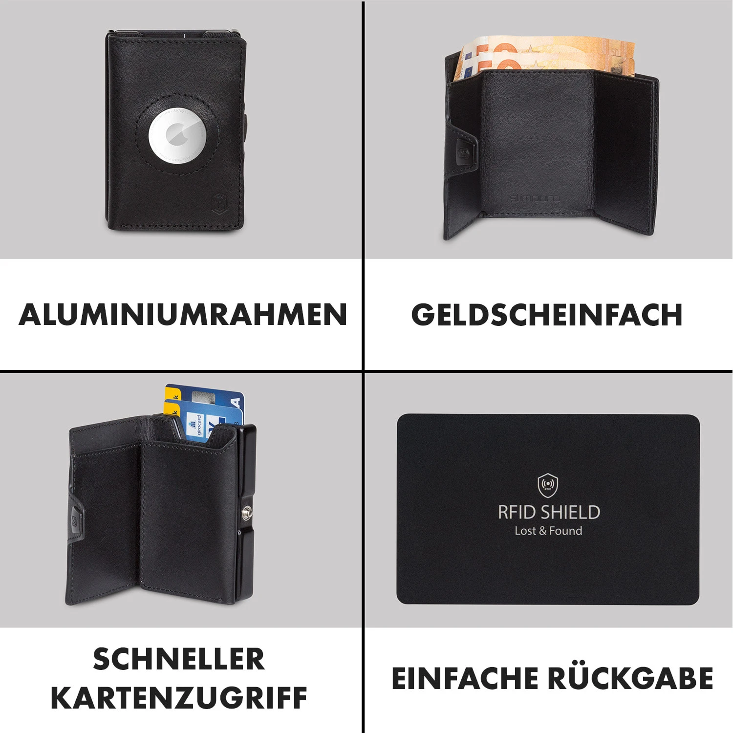 - 360° RFID-Schutz durch den Aluminium-Rahmen und zusätzliche RFID-Shield Karte